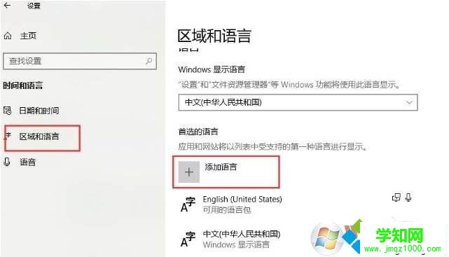 5、在設置中選擇“區域和語言”,點擊添加語言