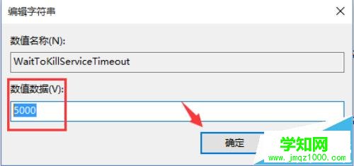 3、鼠標雙擊 WaitToKillServiceTimeOut 選項,在彈出的 編輯器字符串 窗口中將 WaitToKillServiceTimeOut 的 數(shù)值數(shù)據(jù) 改為 5000 ,然后再點擊 確定 按鈕。如圖所示;