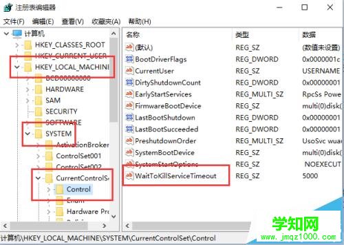 2、在彈出的 注冊表編輯器 窗口中, 依次點擊文件夾定位到 HKEY_LOCAL_MacHINE/SYSTEM/CurrentControlSet/Control 項目中的 WaitToKillServiceTimeOut 。如圖所示;