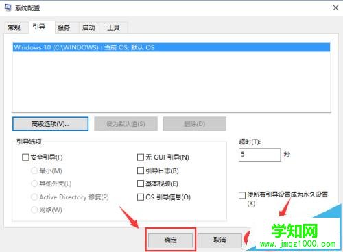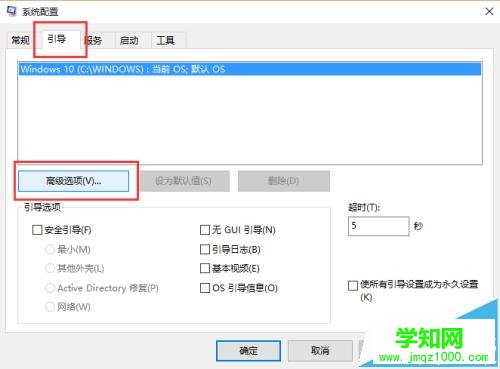 2、在彈出的 系統(tǒng)配置 窗口中選擇 引導(dǎo) 選項卡,將窗口切換到引導(dǎo)選項窗口系界面,再點擊引導(dǎo)窗口界面中的【高級選項(V)】按鈕。如圖所示;