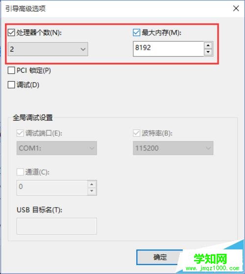 3、在彈出的 引導(dǎo)高級選項 窗口界面中,把 處理器數(shù)(N) 選項勾選上并把它的數(shù)值設(shè)為2、然后再把 最大內(nèi)存(M) 選項也勾選上(然后系統(tǒng)會自動識別當前用戶使用的內(nèi)存大小)。設(shè)置好以后在點擊 確定 。如圖所示;