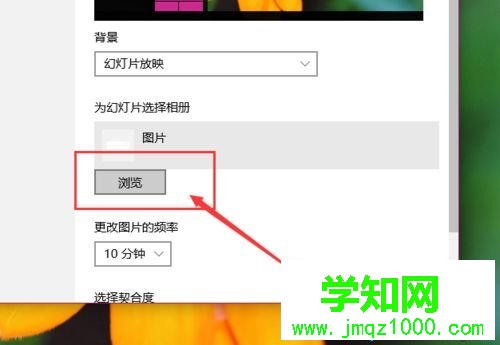 5、選擇好幻燈片放映模式之后,點擊選擇“瀏覽”按鈕,選擇存有桌面背景圖片的文件夾,然后點擊“選擇文件夾”即可。