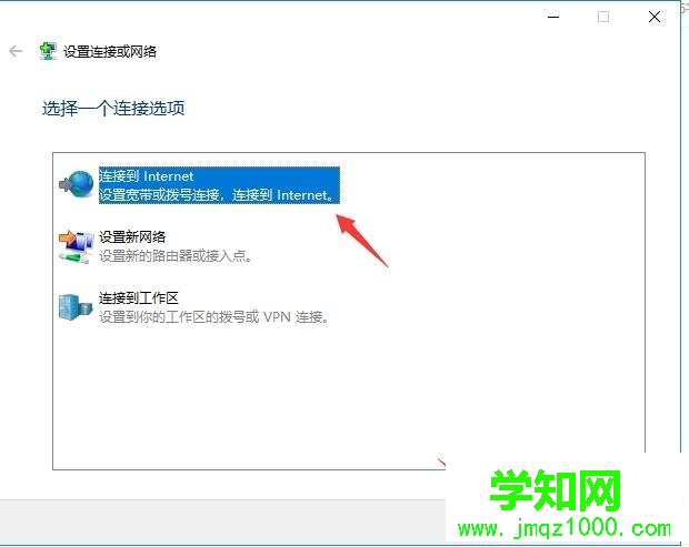 繼續選擇 設置新的連接和網絡 ,進入之后會彈出一個選擇列表框框。連接選項有 連接到internet 、 設置新網絡 、 連接到工作區 ,直接選擇 連接到internet ,點 下一步 。如圖1-2所示。