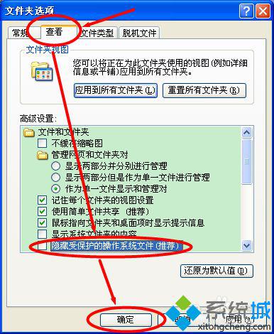 4、在彈出的選項卡中點擊查看,找到“隱藏受保護的操作系統文件”,把前面的勾勾選掉。