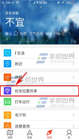 1.打開騰訊地圖,然后點擊下方的【發現】,然后點擊【好友位置共享】;(如下圖)