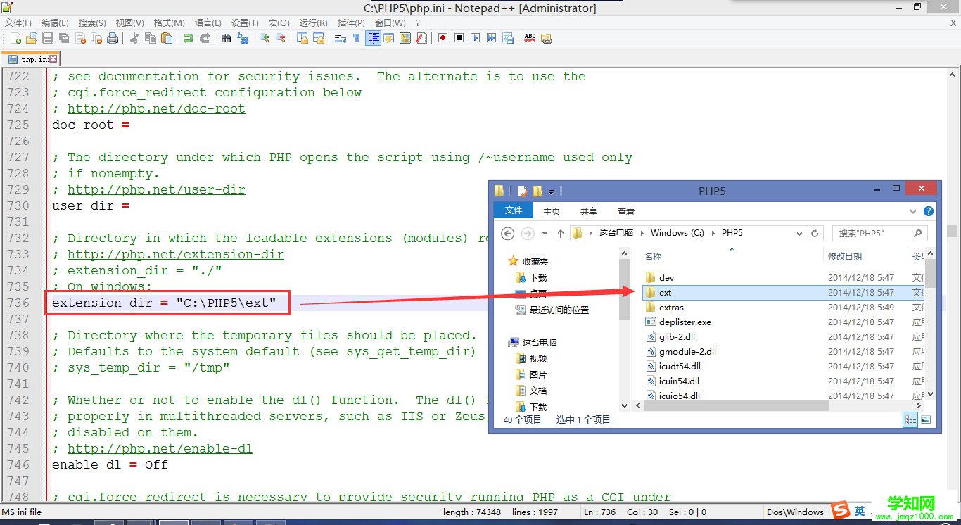 然后搜索“extension_dir”,去掉前面的分號,并且指定PHP環境擴展文件所在目錄,也就是下載PHP中的ext文件夾,例如我的: