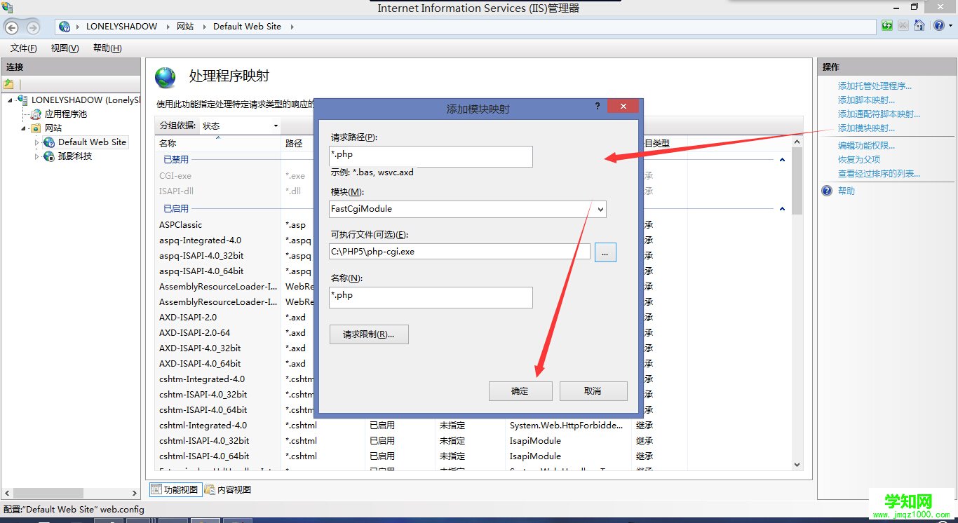 打開“處理程序映射”,點擊右側的“添加模塊映射”,彈出模塊映射設置窗口,名稱輸入“*.php”,模塊選擇“FastCgiModule”,執行程序選擇你剛剛下載配置的PHP目錄中的“php-cgi.exe”,最后確定: