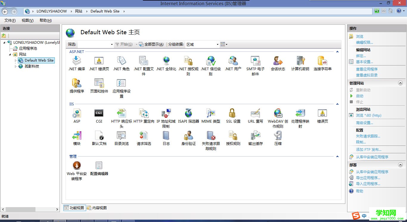 左側網站中會有一個默認站點“Default Web Site”,默認自動啟動的,我們訪問"http://localhost",會顯示IIS 8的歡迎界面,表示IIS啟用成功: