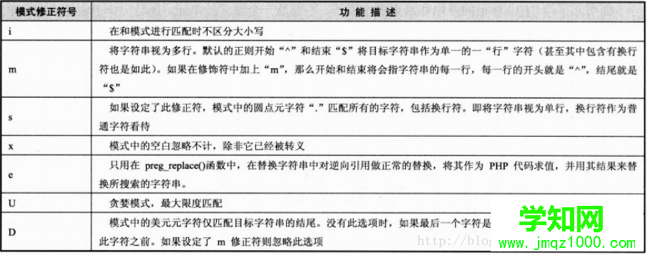 1.4 模式修正符:在正則的定界符之外使用,擴展正則在匹配、替換等方面的功能。