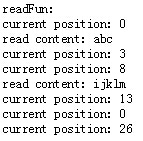 比如我現(xiàn)在使用該方法讀取一個(gè)寫有從a到z的文本文件,看看效果: