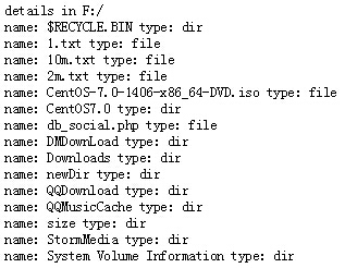 <?php // 目錄的讀取 $dir = 'F:/'; echo 'details in '.$dir.'<br>'; if(is_dir($dir)){ if(($handle = opendir($dir)) == false){ // 獲取目錄句柄 echo 'open dir failed'; return; } while(($name = readdir($handle)) != false){ // 循環(huán)讀取該目錄下內(nèi)容 $filepath = $dir.'/'.$name; echo 'name: '.$name.' type: '.filetype($filepath).'<br>'; } closedir($handle); // 關(guān)閉目錄句柄 } else{ echo $dir.' is not a directory<r>'; }