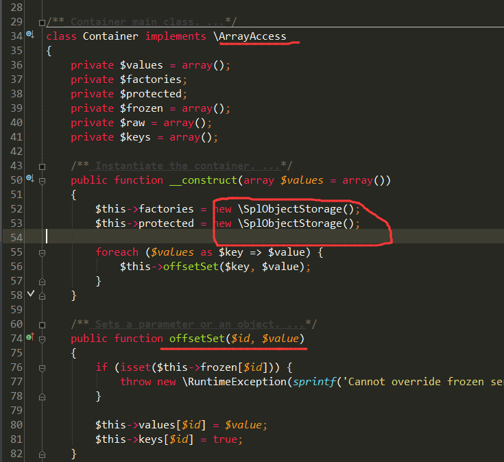 1 <?php 2 class Test implements ArrayAccess 3 { 4 private $testData; 5 6 public function offsetExists($key) 7 { 8 return isset($this->testData[$key]); 9 }10 11 public function offsetSet($key, $value)12 {13 $this->testData[$key] = $value;14 }15 16 public function offsetGet($key)17 {18 return $this->testData[$key];19 }20 21 public function offsetUnset($key)22 {23 unset($this->testData[$key]);24 }25 }26 27 $obj = new Test();28 29 //自動調用offsetSet方法30 $obj['data'] = 'data';31 32 //自動調用offsetExists33 if(isset($obj['data'])){34 echo 'has setting!';35 }36 //自動調用offsetGet37 var_dump($obj['data']);38 39 //自動調用offsetUnset40 unset($obj['data']);41 var_dump($test['data']);42 43 //輸出:44 //has setting!45 //data 46 //null好了,下面我們會結合Slim框架來說在實際中的應用,在Slim中使用非常重要,也非常出色的使用了 container,container繼承自PimpleContainer,說到這,就有必要說一下Pimple,pimple是php社區中比較流行的一種ioc容器,pimple中的container類使用了依賴注入的方式來實現實現了程序間的低耦合,可以用composer添加 require 'pimple/pimple': '1.*' 添加Pimple到依賴類庫,Pimple還是要多看看的,就一個文件,在程序整個生命周期中,各種屬性、方法、對象、閉包都可以注冊其中,但pimple只是實現了一個容器的概念,還有好多依賴注入、自動創建、關聯等功能需要看Laravel才能深刻學到。