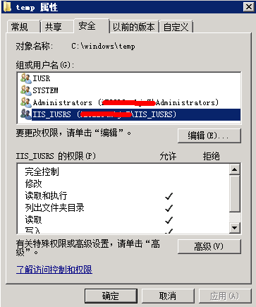 更改后的權限配置(必須包含IUSER和IIS_IUSERS權限或Everyone)