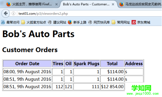 <?php //create short variable name $DOCUMENT_ROOT = $_SERVER['DOCUMENT_ROOT'];?><html><head> <title>Bob's Auto Parts - Customer Orders</title></head><body><h3>Bob's Auto Parts</h3><h4>Customer Orders</h4><?php //Read in the entire file. //Each order becomes an element in the array $orders= file('$DOCUMENT_ROOT/orders.txt'); // count the number of orders in the array $number_of_orders = count($orders); if ($number_of_orders == 0) { echo '<p><strong>No orders pending. Please try again later.</strong></p>'; } echo '<table border='1'>'; echo '<tr><th bgcolor='#CCCCFF'>Order Date</th> <th bgcolor='#CCCCFF'>Tires</th> <th bgcolor='#CCCCFF'>Oil</th> <th bgcolor='#CCCCFF'>Spark Plugs</th> <th bgcolor='#CCCCFF'>Total</th> <th bgcolor='#CCCCFF'>Address</th> <tr>'; for ($i=0; $i<$number_of_orders; $i++) { //split up each line $line = explode(' ', $orders[$i]); // keep only the number of items ordered $line[1] = intval($line[1]); $line[2] = intval($line[2]); $line[3] = intval($line[3]); // output each order echo '<tr> <td>'.$line[0].'</td> <td align='right'>'.$line[1].'</td> <td align='right'>'.$line[2].'</td> <td align='right'>'.$line[3].'</td> <td align='right'>'.$line[4].'</td> <td>'.$line[5].'</td> </tr>'; } echo '</table>';?></body></html>