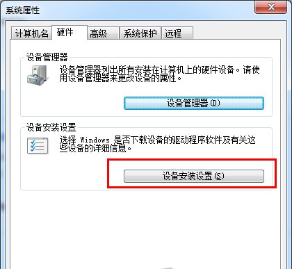 2. 在彈出的窗口中,選擇“硬件”的選項卡,然后點擊“設備安裝設置”;
