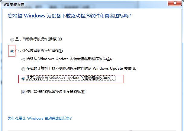 3. 點擊“設備安裝設置”之后,會彈出一個窗口,在這里“否”的“從不安裝來自windows update的驅動程序軟件”;