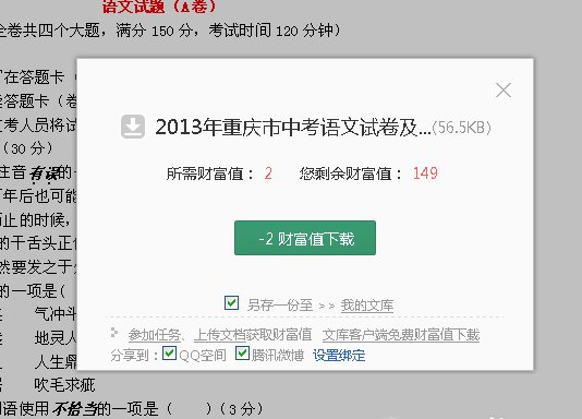 需要說明的是,如果提示你的財富值不足,無法下載的話,可以上傳一些你個人覺得比較有用的一些word文檔,上傳可以獲得財富值,別人下載你的文檔你的賬號下也能得到財富值。