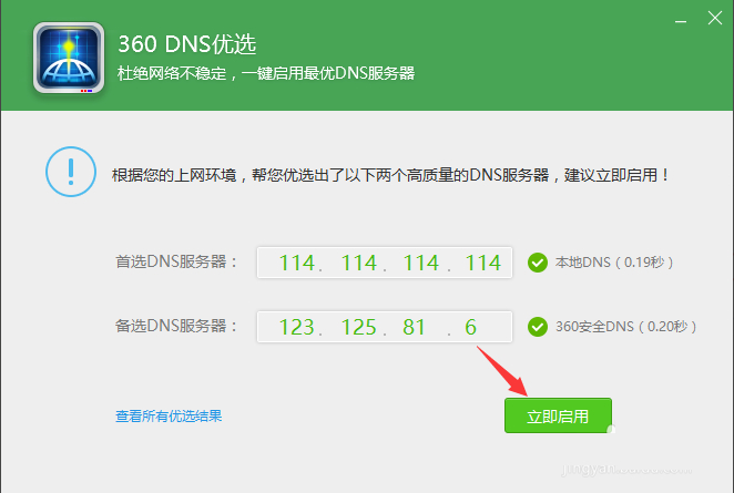 在“360 DNS優選”界面中,將自動給出最佳“首選DNS”和“備用DNS”,在此直接點擊“立即啟用”按鈕。