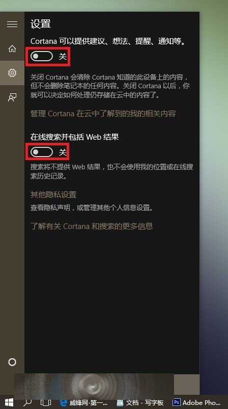 要關閉在線搜索功能很簡單,只要點擊任務欄中的搜索按鈕,然后點擊彈出窗口左側的設置圖標,然后在菜單中關閉“在線搜索并包括 Web 結果”即可,如果你不用 Cortana 的話最好也一并關掉,因為每次打開它總會自動聯網,更新當地天氣、日歷信息和今天頭條新聞等內容已推薦給你。