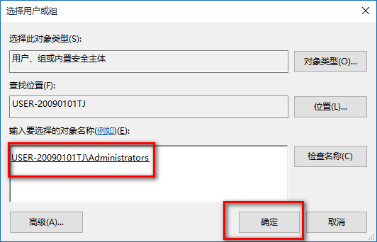 8、本機用戶名已經顯示的輸入要選擇的對象名稱欄內,點擊:確定
