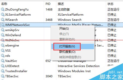 2、切換到服務(wù)頁(yè)面,隨便選中一個(gè)服務(wù),右鍵,選擇“打開(kāi)服務(wù)”。
