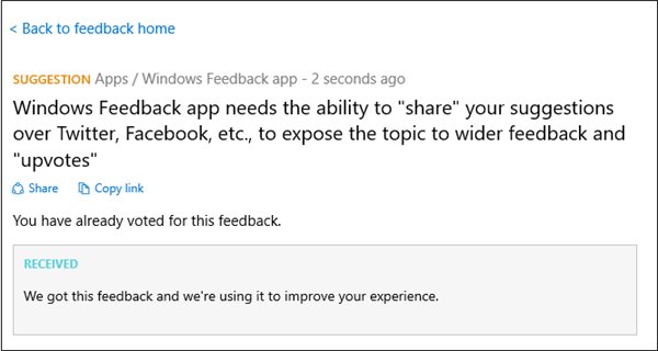 可通過分享按鈕反饋,也可復制鏈接進行分享。由于《Windows反饋》是通用應用,意味著下一個Windows10 Mobile預覽版中也將加入同樣的特性。