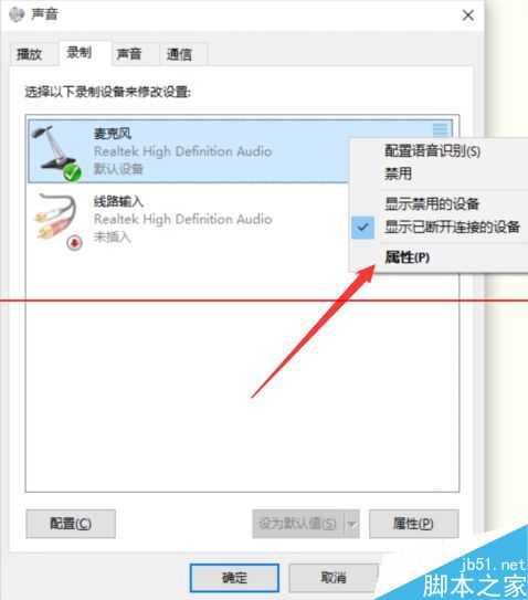3、在這里可以看到我們的麥克風(fēng)設(shè)備是否在工作,右鍵默認(rèn)麥克風(fēng),選擇屬性