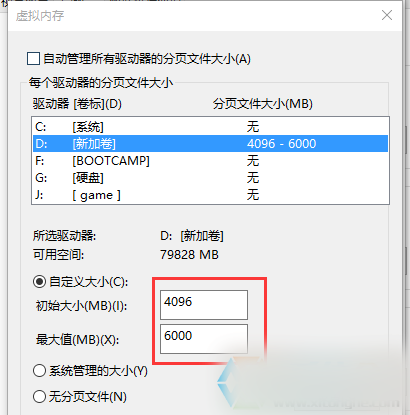 6、然后選擇系統分區以外的分區,選擇自定義大小,最小值為內存大小兩倍(2G物理內存=2G*2*1024=4096MB)最大值自定。再點設置,重啟后生效。