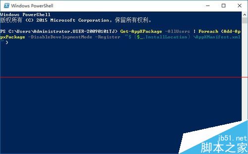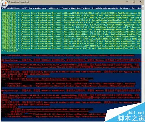 3、輸入如下命令后回車  Get-AppXPackage -AllUsers | Foreach {Add-AppxPackage -DisableDevelopmentMode -Register “$($_.InstallLocation)AppXManifest.xml”}