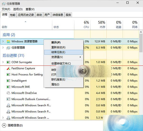 第二步、在任務管理器界面,點擊選擇停止響應的程序后,點擊底部“結束任務”,或者右鍵該程序,選擇“結束任務”。