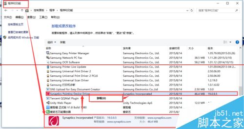 3、在彈出的【控制面板】下找到【程序】→【卸載程序】→找到【synaptics pointing device driver】右鍵【卸載】