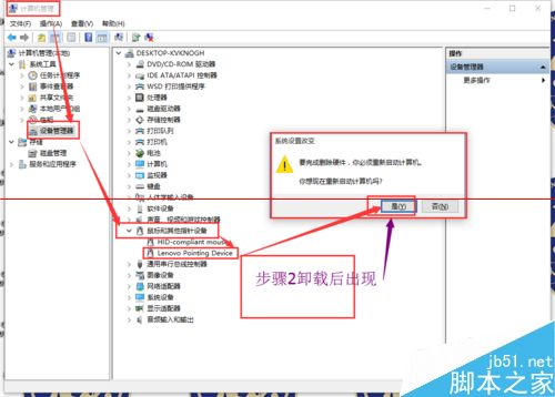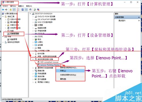 2、彈出【計算機管理后】找到【設備管理器】后【單機左鍵】,找到【鼠標和其他指針設備】后單機找到【lenovo Point...】右鍵【卸載】