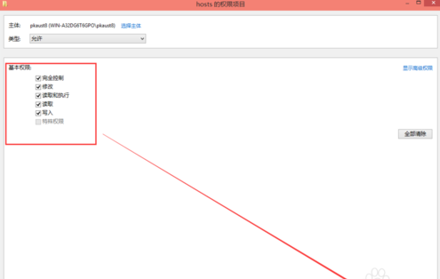 將hosts的權(quán)限項(xiàng)目界面下的基本權(quán)限的所以項(xiàng)目都勾選上,然后點(diǎn)擊確定,如下圖所示。