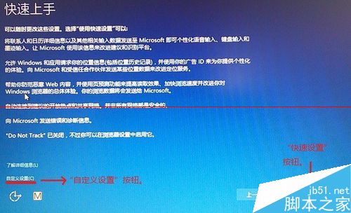 在如圖的頁面里,簡單的點擊“使用快速設置”按鈕省時省力,但是使共享語音、輸入、聯系人、日歷、地點和廣告 ID 等信息成為可能。如果在意這些信息的安全性,那就點擊左邊的“自定義設置”(字比較小,所有必須有但又不愿讓你看見的內容,都這德性)。