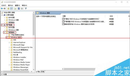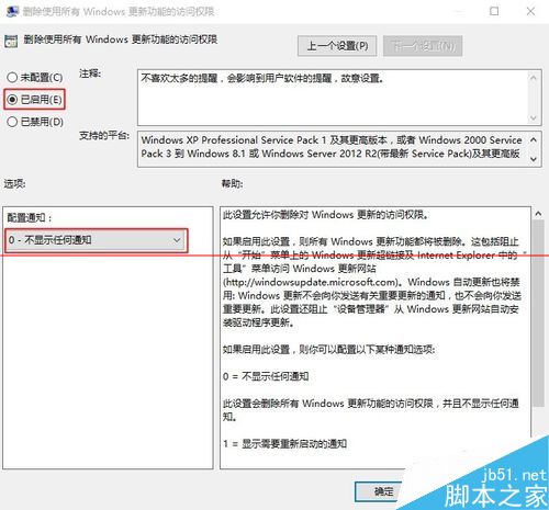 3、以上步驟完成,再看右邊欄,選擇“用戶配置”下的“管理模板”,順序同上,“管理模板>>Windows組件>>Windows更新>>刪除使用所有Windows更新功能的訪問權限”,繼續選擇“已啟用“,并同時選擇”0 - 不顯示任何通知“單擊”應用“保存,此步驟用于屏蔽微軟的更新提示。