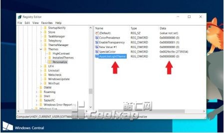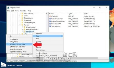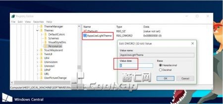 重復上述步驟,只是這次的路徑是HKEY_CURRENT_USER SOFTWARE Microsoft Windows CurrentVersion Themes Personalize。再一次,創建一個新AppsUseLightTheme的雙字節(32-bit)鍵值,賦值為0。