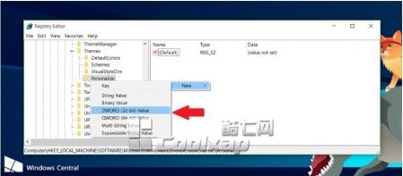 右擊Personalize,選擇新建>雙字節(32-bit)鍵值