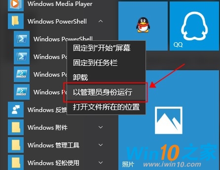2. 我們可以直接在開始菜單的“所有應用”中找到“Windows PowerShell”文件夾下的“Windows PowerShell”,右單擊在彈出的菜單中選擇“以管理員身份運行”即可;