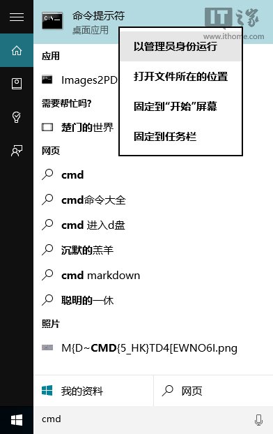 ①在Cortana搜索欄輸入CMD,然后在第一個結果點擊右鍵,選擇“以管理員身份運行”