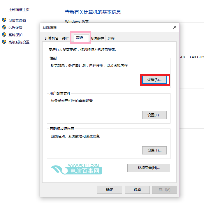 點擊進入系統屬性的高級選項卡,點擊性能下方的設置。打開的窗口可以設置性能視覺效果,處理器計劃,內存使用,以及虛擬內存。如下圖所示。
