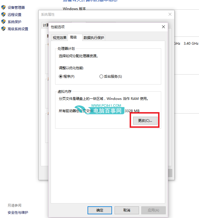在性能選項對話框的高級選項卡里點擊虛擬內存下方的更改,如下圖所示