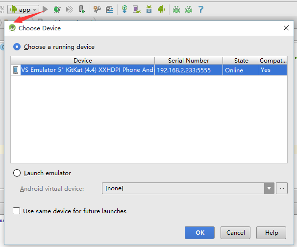 第三節的按鈕只是啟動了模擬器,但是Andorid Studio還無法連接到模擬器,這里就要使用adb命令來連接到剛才啟動的模擬器上 。