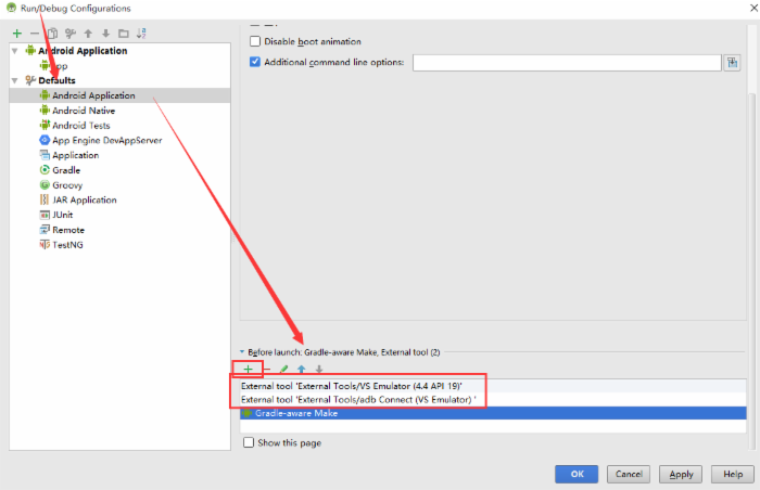 打開 Run > Edit Configurations > Defaults / Android Application / Emulator 選項卡的BeforeLaunch 節點, 把我們剛才創建的兩個 External Tool 添加到此處 , 記得不要忘記點Apply和OK,順序如下: