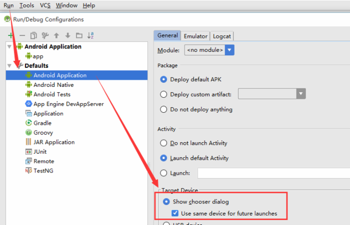 打開Android Studio> Run > Edit Configurations > Defaults / Android Application /General 選項卡的 Target Device 節點,勾選 Show chooser dialog 和 Use same device for future launches 。 記得不要忘記點Apply和OK。 如下圖: