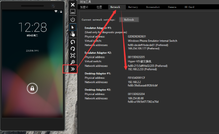 Parameters:添加adb.exe的參數,connect ip:5555;筆者的是 192.168.2.233:5555。ip可以通過打開模擬器在wifi中查看,也可以在模擬器的設置中network中查看