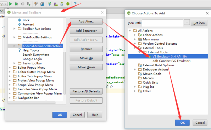 在toolbar空白處點擊右鍵,選擇 Customize Menus and Toolbars 。然后導航到Main Toolbar > Add After >在彈出的面板中找到 External tool > VS Emulator (4.4 API 19) 然后按 OK 。 如下: