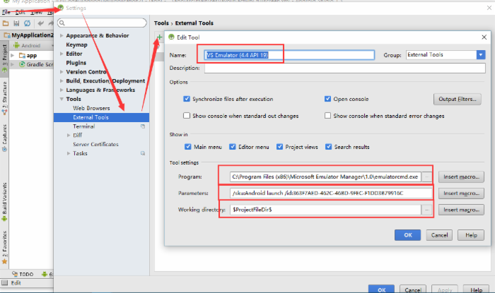 Program:填寫Visual Studio Emulator for Android安裝目錄下的emulatoecmd.exe的絕對路徑,就是用它來啟動模擬器的。筆者的是 C:Program Files (x86)Microsoft Emulator Manager1.0emulatorcmd.exe 。