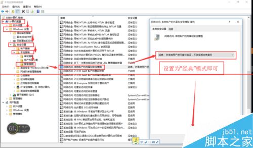2、“計算機配置”→“Window設置”→“安全設置”→“安全選項”→“網絡訪問:本地賬戶的共享和安全模型”→設置為“經典-對本地用戶進行身份驗證,不改變起本來身份”