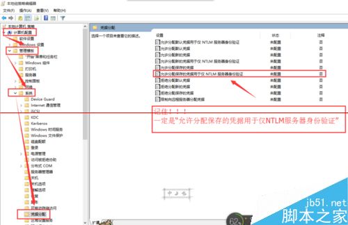 3、依次展開“計算機配置”→“管理模版”→“系統”→“憑據分配”→找到“允許分配保存的憑據用于僅NTLM服務器身份驗證”