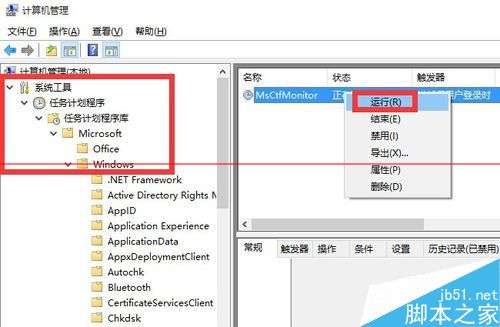 2、從打開的“計算機管理”界面中,依次展開“系統工具”-“任務計劃程序”-“任務計劃程序庫”-“Microsoft”-“Windows”-“TextServicesFramework”菜單項,在窗口的右側找到“MsCtrMonitor”項,右鍵點擊MsCtrMonitor項,從其右鍵菜單中選擇“進行”項。